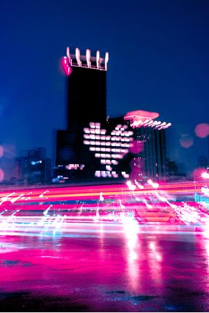 A building near Ximen in Taiepei lights up in the shape of a heart on a rainy vibrant night.